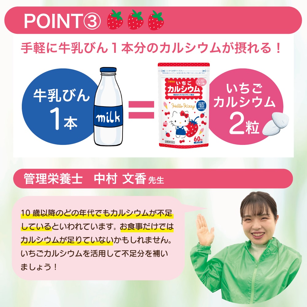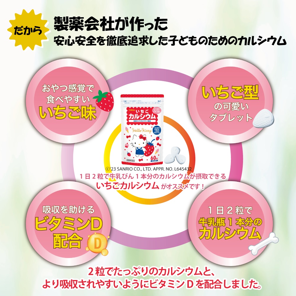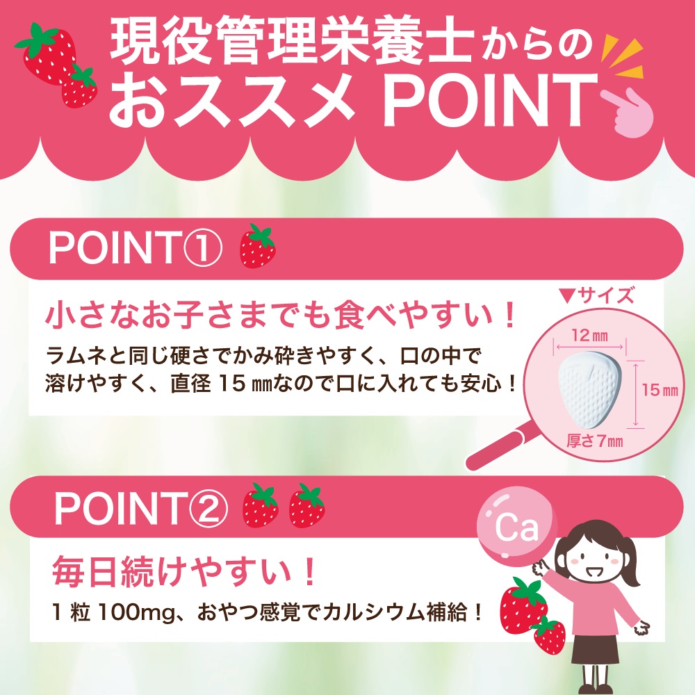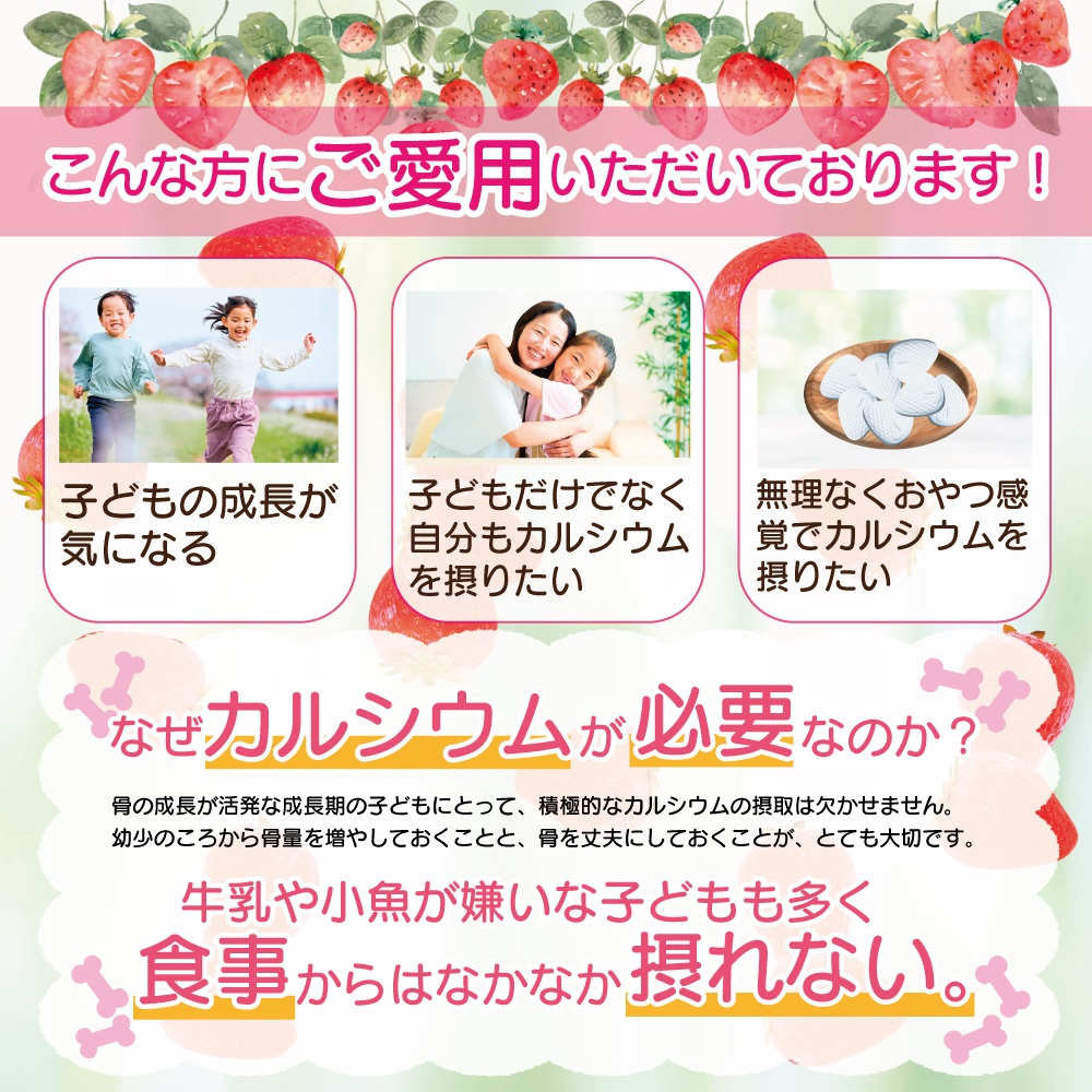 グラニュ糖、ミルクカルシウム、食用卵殻粉、いちご果汁パウダー/酸味料、ショ糖エステル、香料、ビタミンD