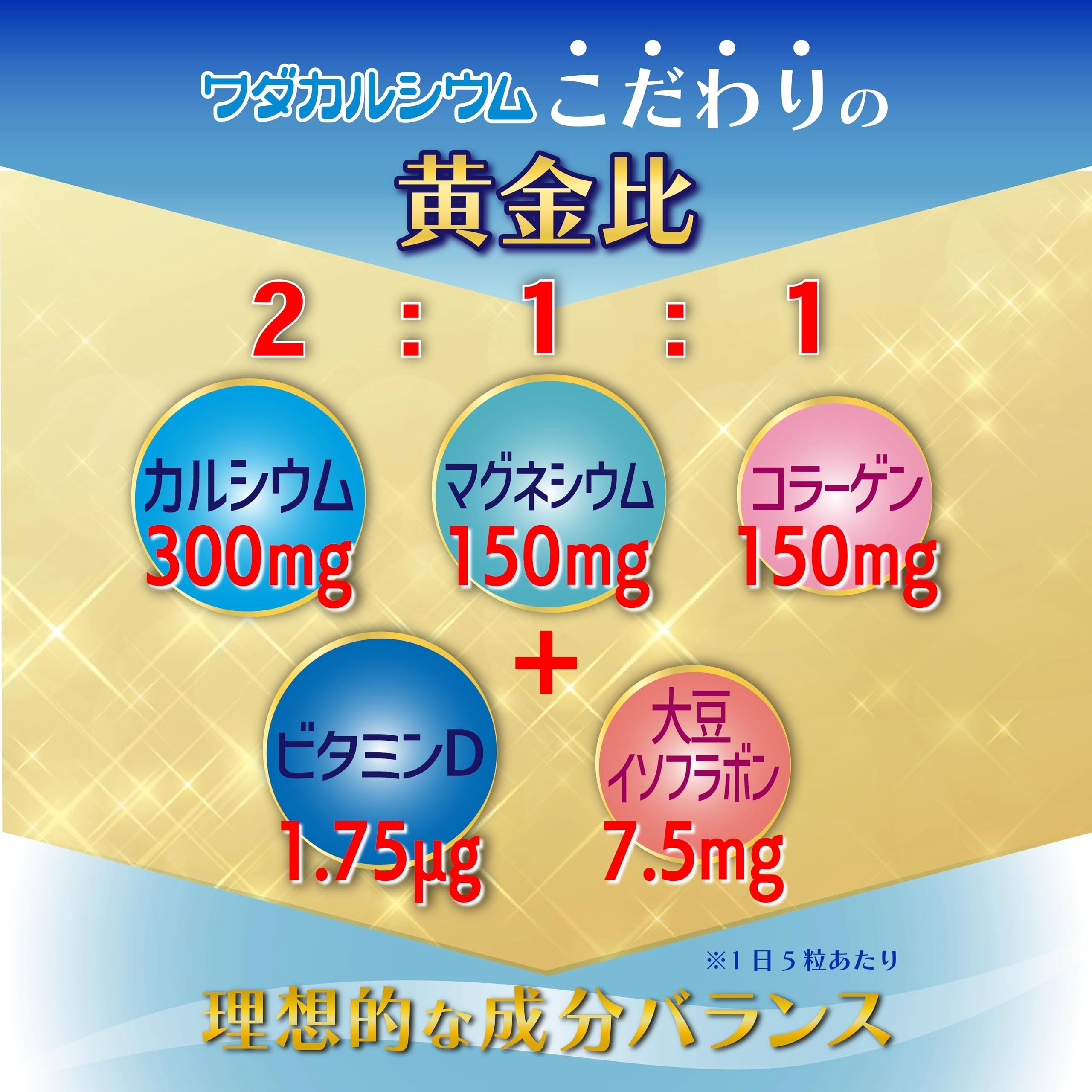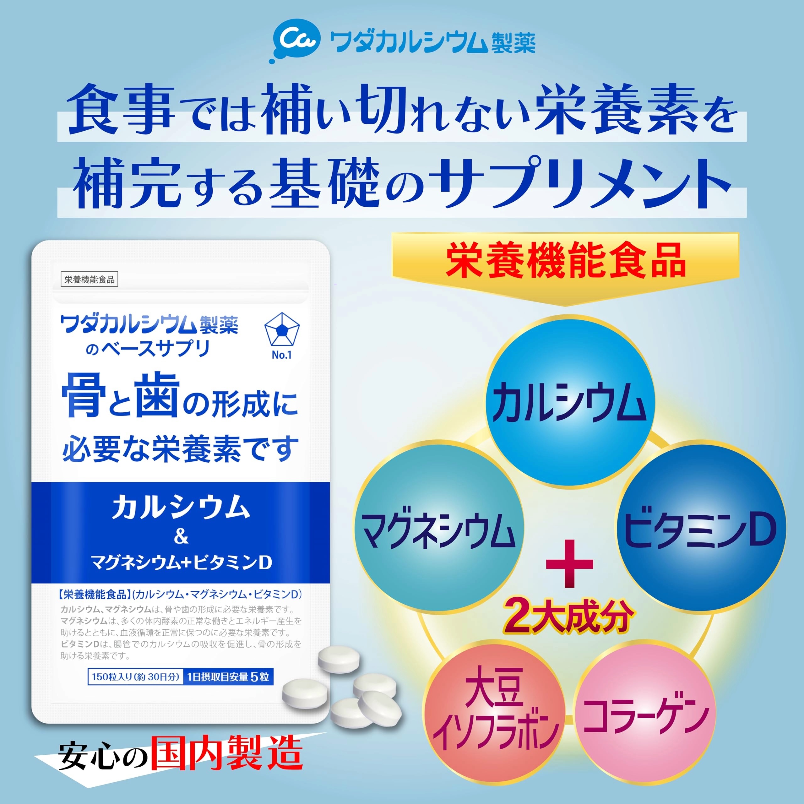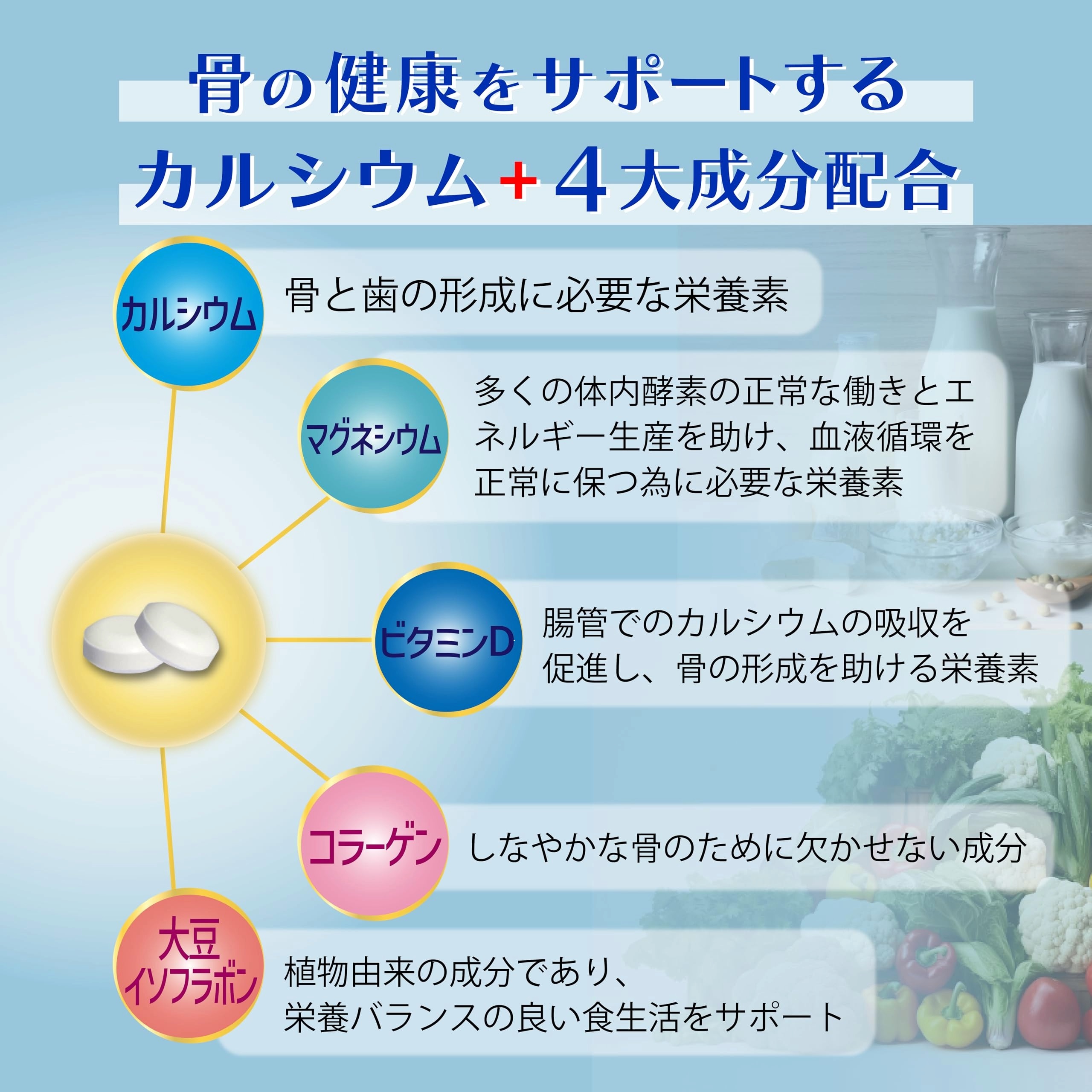 【こだわり成分】[カルシウム]骨や歯の形成に必要な栄養素。[マグネシウム]カルシウムと共に骨を形成する要素。[ビタミンD]腸管でのカルシウムの吸収を促進し、骨の形成を助ける栄養素です。[コラーゲン]しなやかな骨のために欠かせない成分。[大豆イソフラボン]植物由来の成分であり、栄養バランスの良い食生活をサポートします。