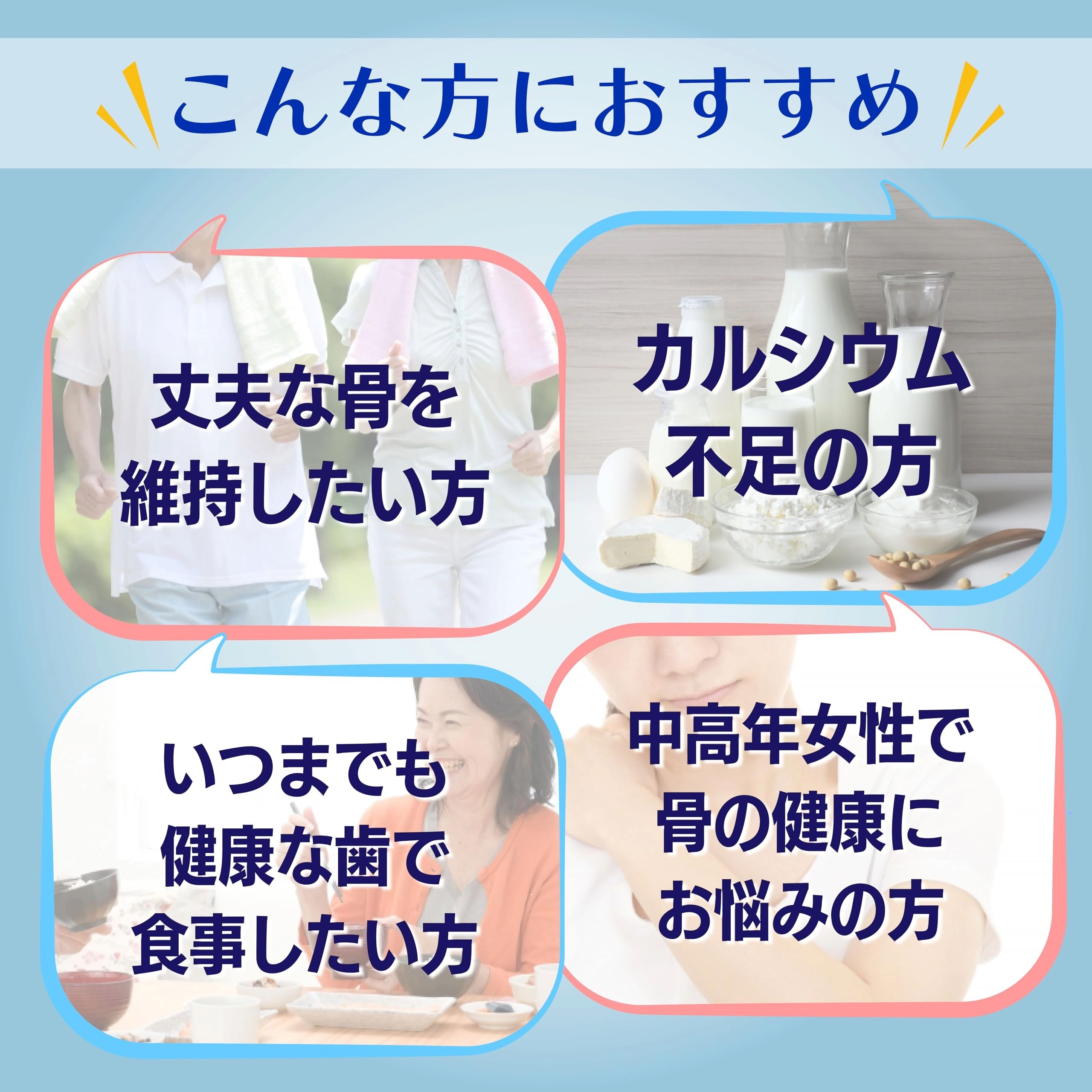 【こんな方におすすめ】カルシウム不足でお悩みの方、丈夫な骨を維持したい方、歯の形成にも