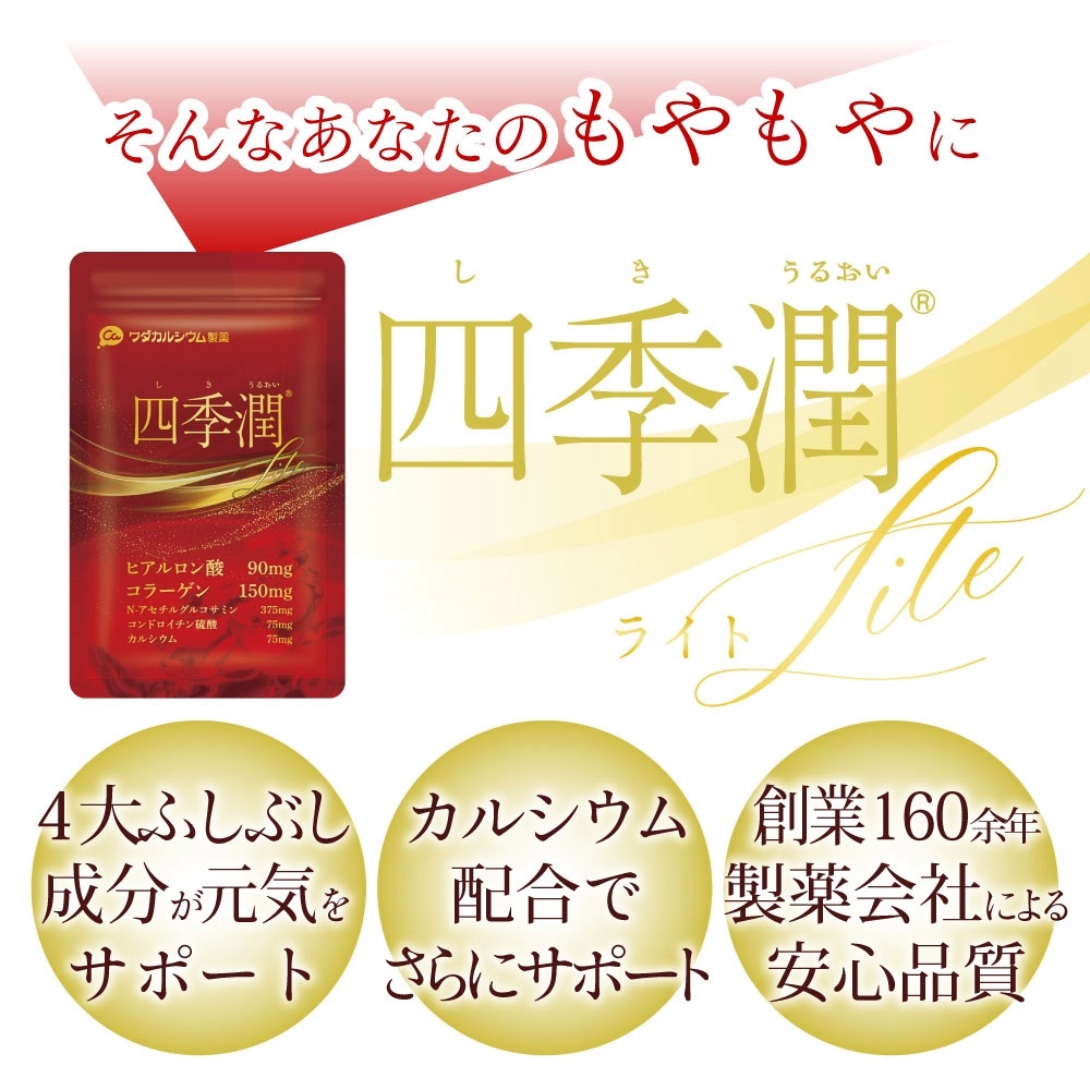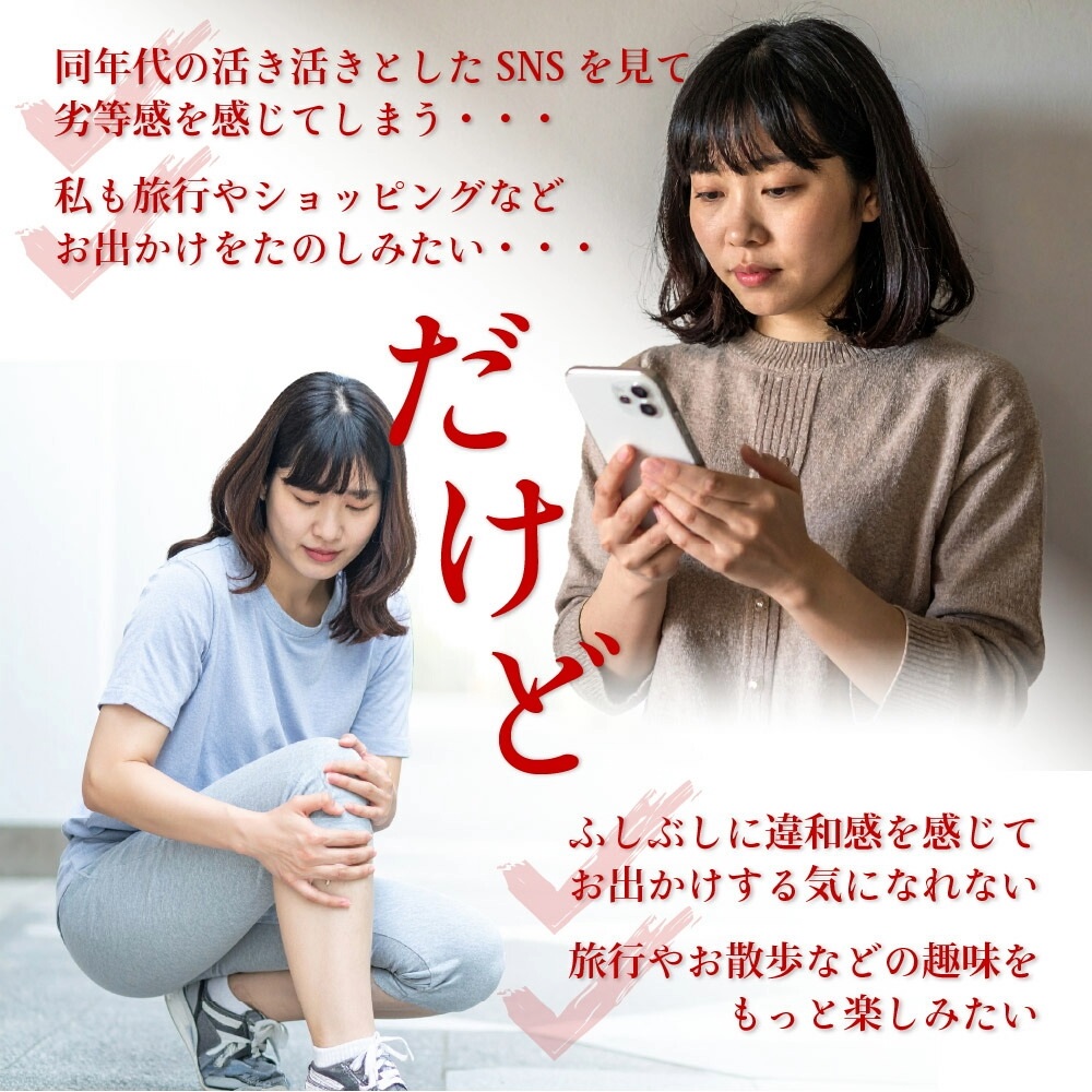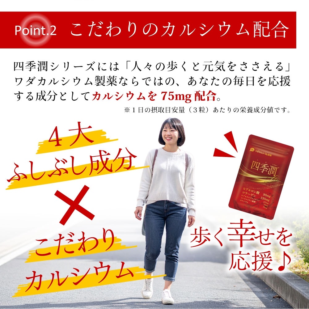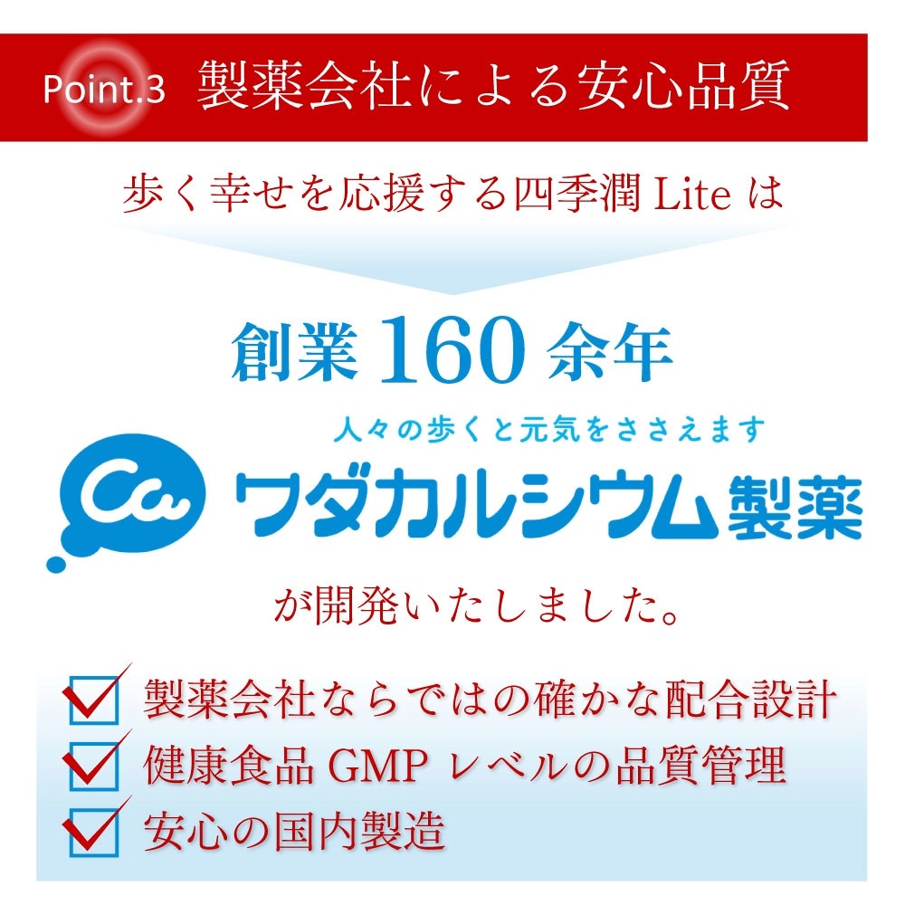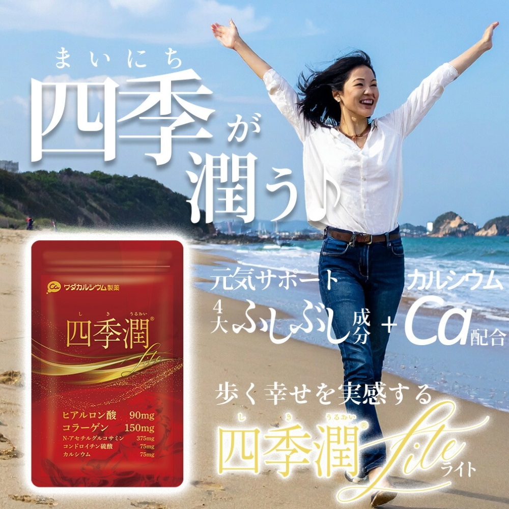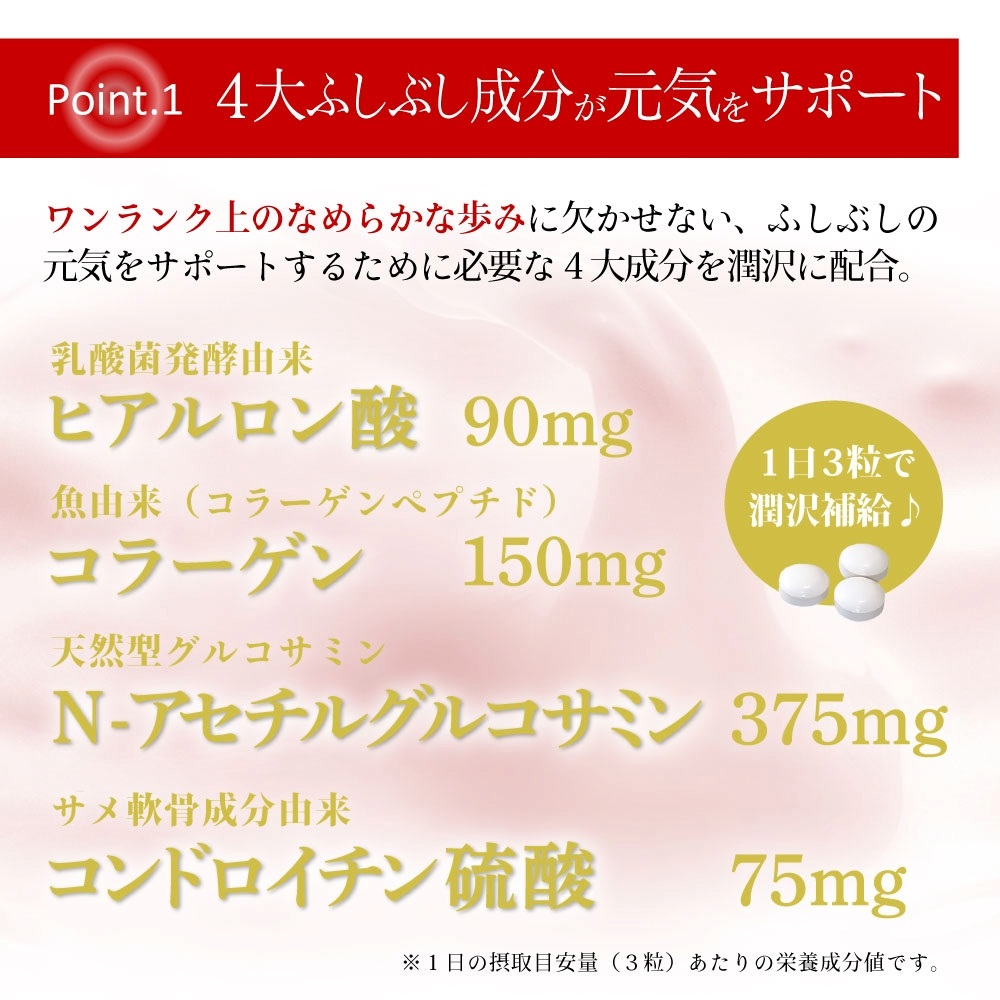 潤滑成分のヒアルロン酸、コラーゲンと軟骨成分のN-アセチルグルコサミン、コンドロイチンで軽快さをサポート。
