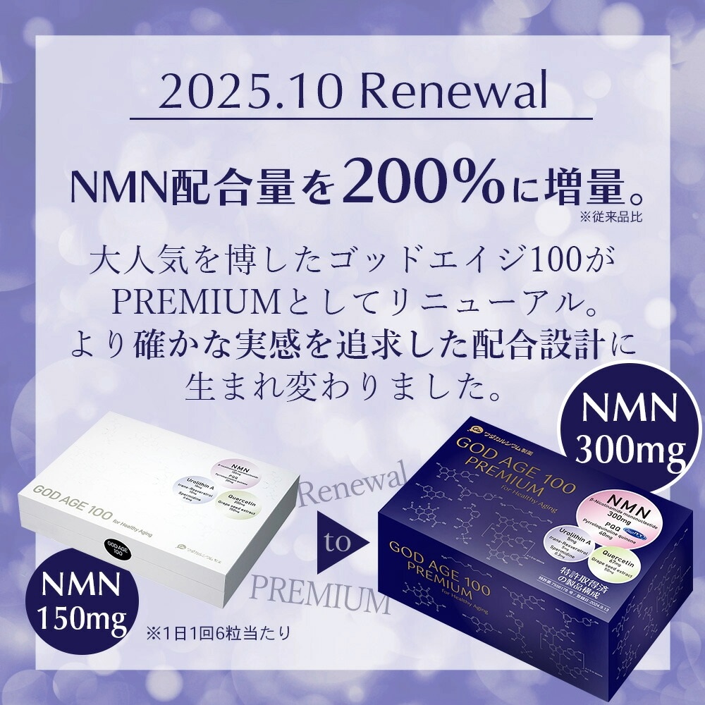 大人気だったゴッドエイジ100が、NMN配合量を200%に増量してリニューアル!