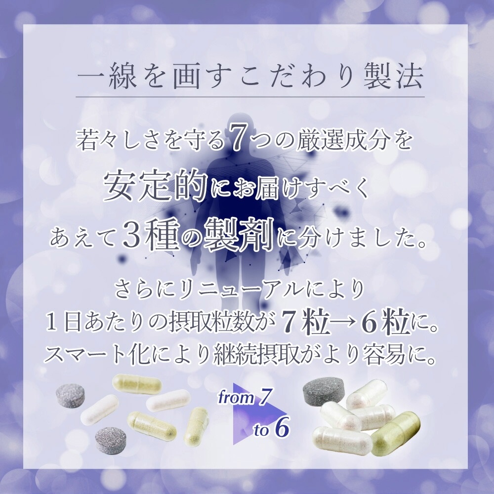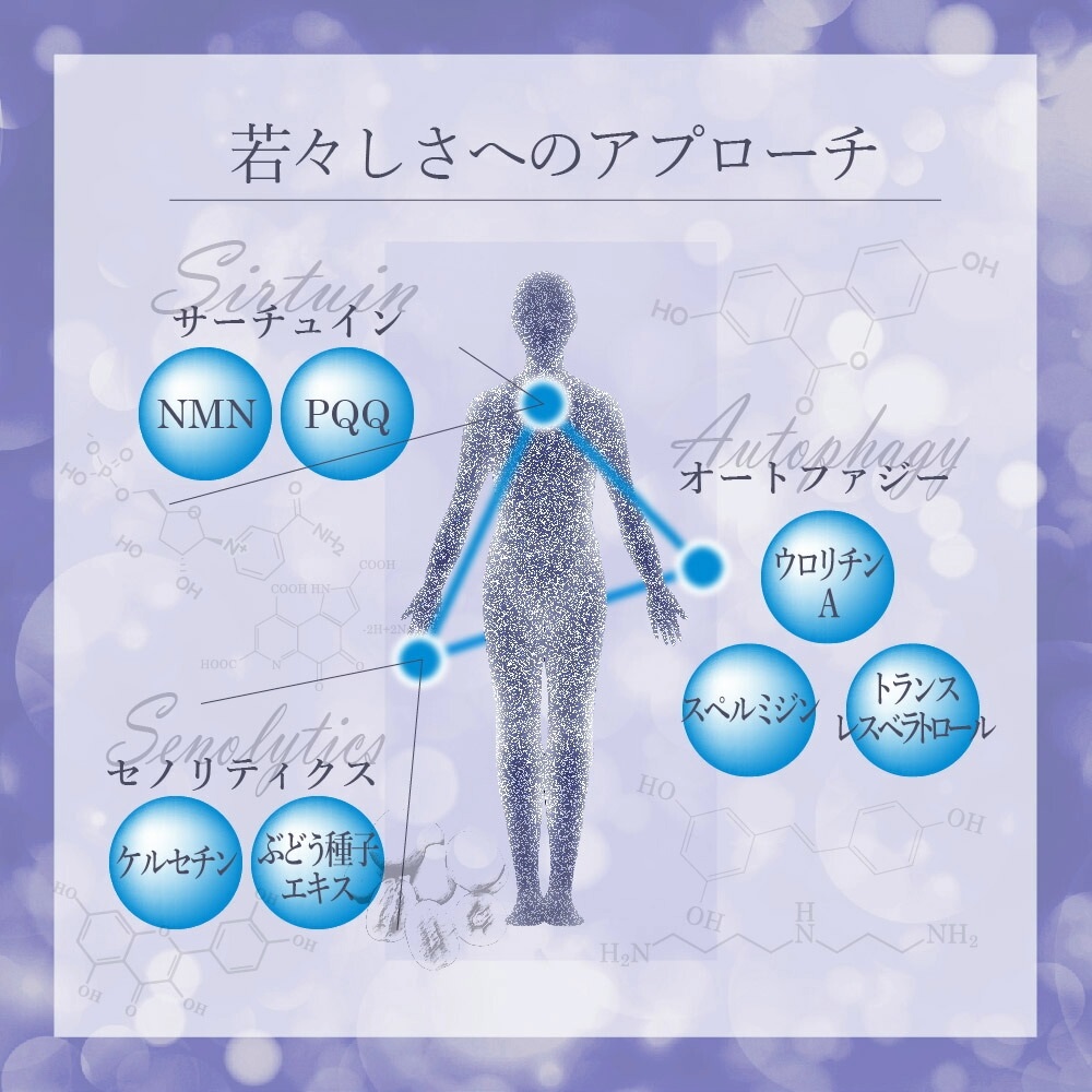 研究が盛んでメディアも注目のNMNをはじめとした、計7つのエイジングケア*成分を独自配合し、3つの役割を発揮することで、若々しさをサポートします。