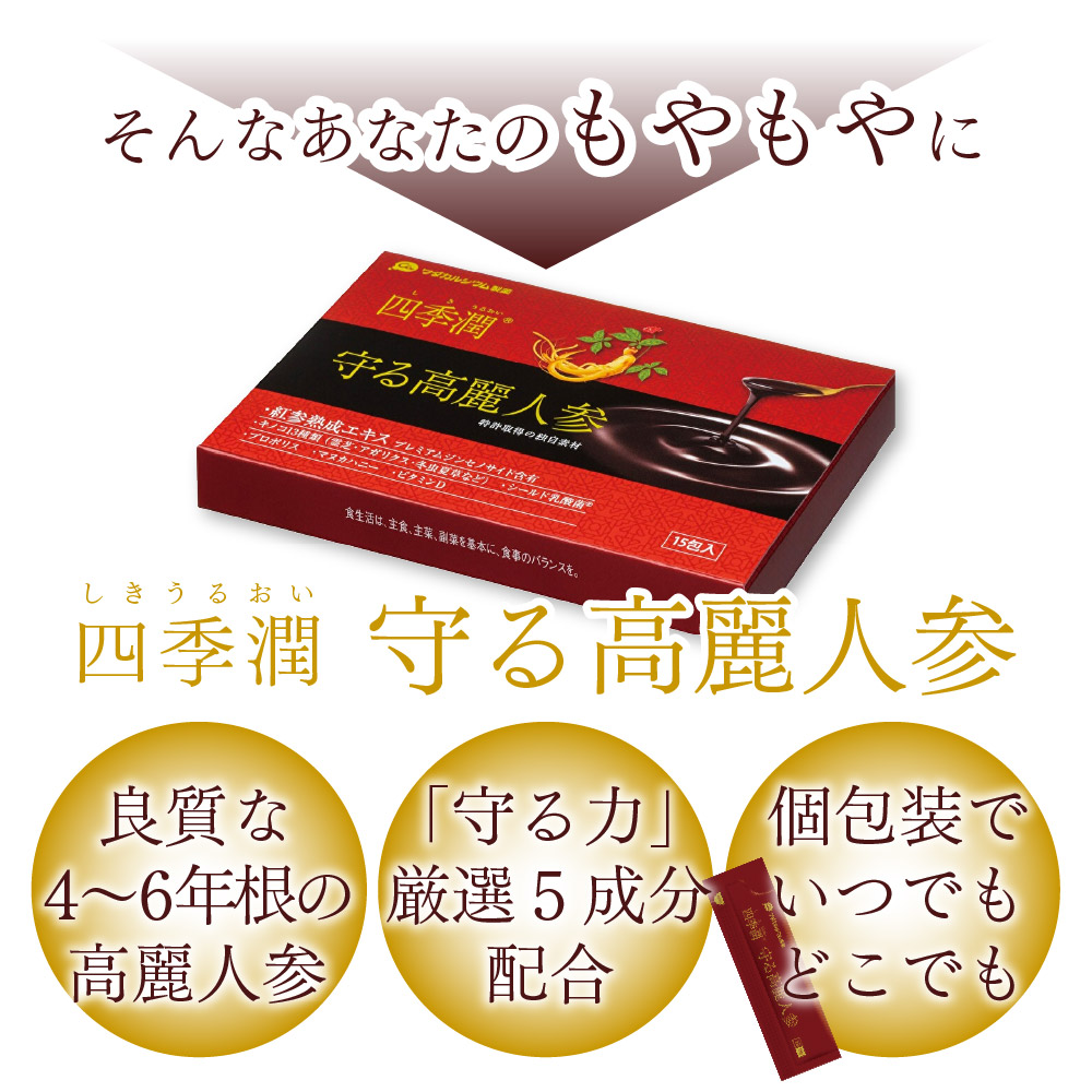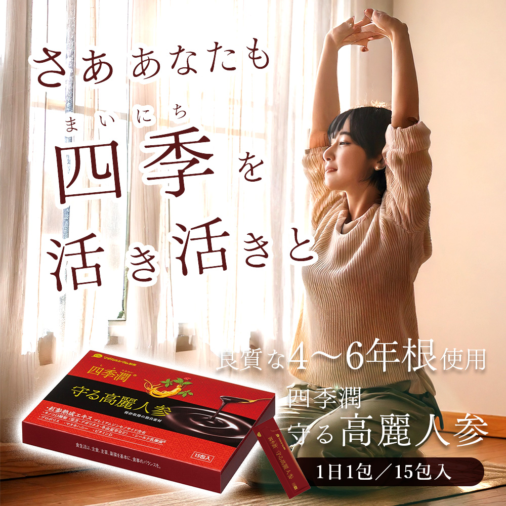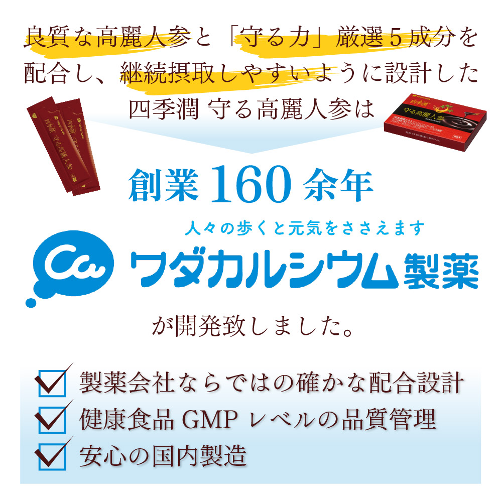 四季潤 守る高麗人参には「紅参」と呼ばれる4~6年根を「蒸す→乾燥」を丁寧に行い栄養価を高めた高麗人参のエキスだけを使用しています。