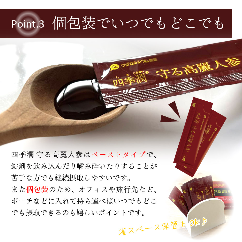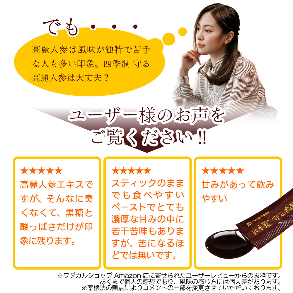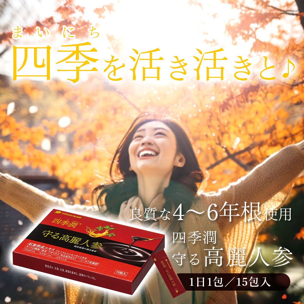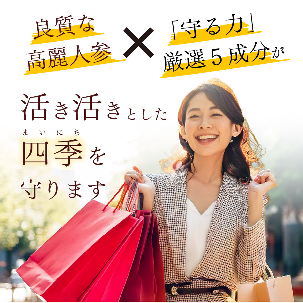 四季潤 守る高麗人参には「紅参」と呼ばれる4~6年根を「蒸す→乾燥」を丁寧に行い栄養価を高めた高麗人参のエキスだけを使用しています。