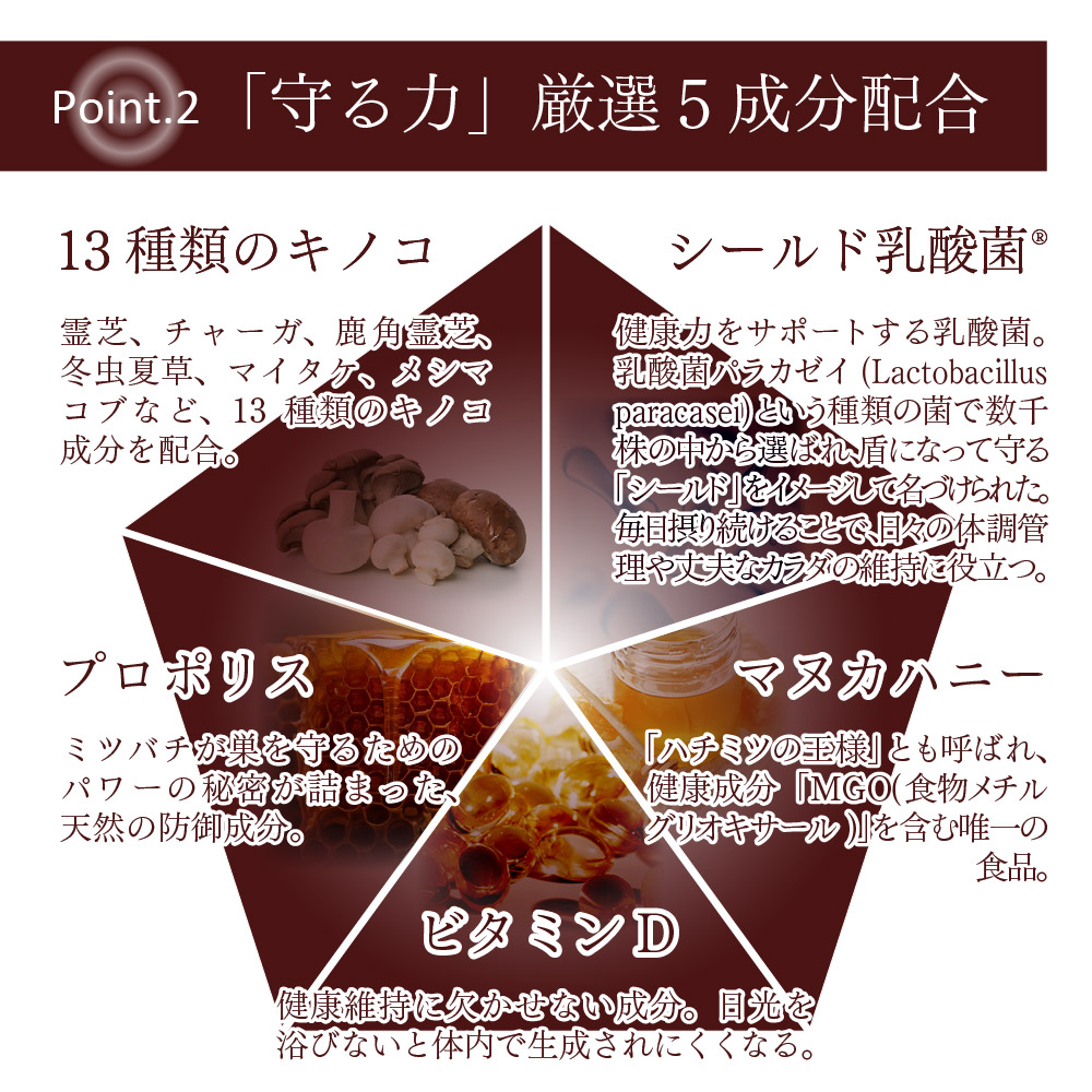 高麗紅参エキス(韓国製造)、黒糖、イソマルトオリゴ糖シラップ、果糖ぶどう糖液糖、マルトデキストリン、精製はちみつ、還元水あめ、フラクトオリゴ糖シラップ、甘草エキス、キノコ混合粉末(霊芝、エリンギ、アガリクス、鹿角霊芝、冬虫夏草、チャーガ、マイタケ、メシマコブ、山伏茸、ハナビラタケ、タモギタケ、シイタケ、シロキクラゲ、ヒハツ)、マヌカハニー、乳酸菌乾燥粉末(殺菌)、プロポリスエキス、ラカンカエキス末/環状オリゴ糖、酸味料、甘味料(スクラロース)、ビタミンD