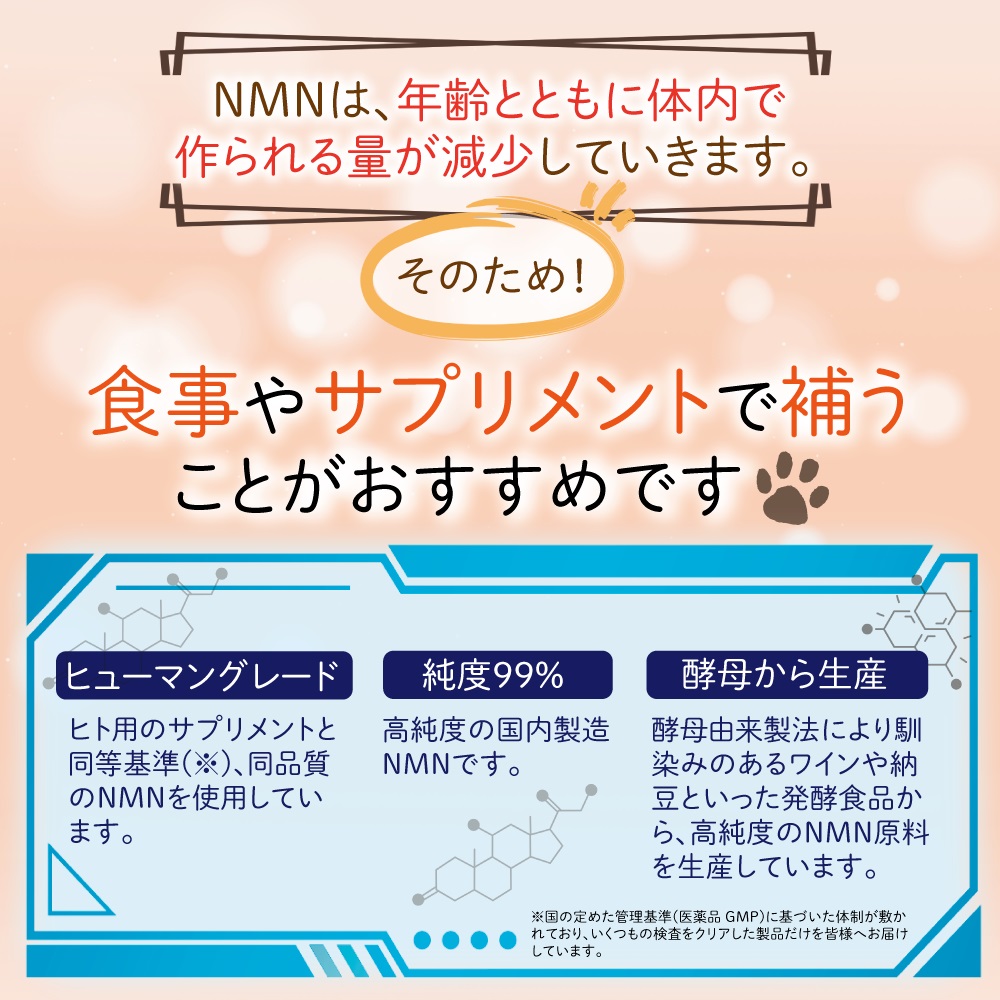 ペットフードにかけるだけで、手軽にNMNを与えることができます。