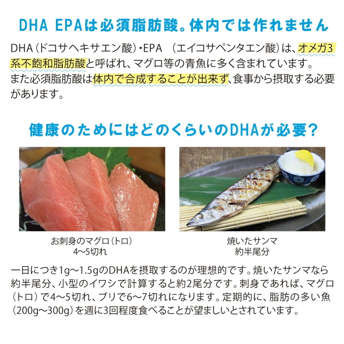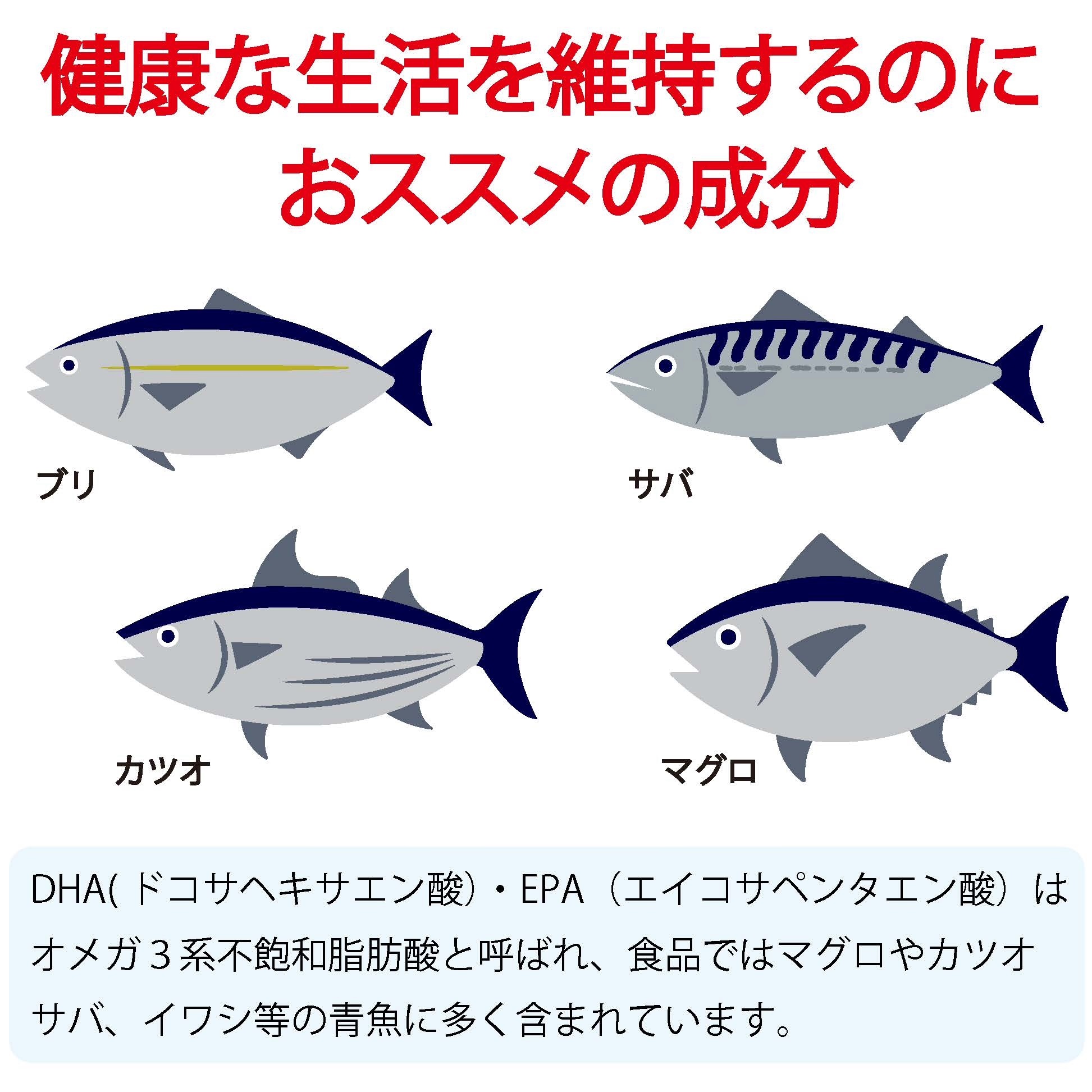 DHA(ドコサヘキサエン酸)・EPA(エイコサペンタエン酸)はオメガ3系不飽和脂肪酸と呼ばれ、食品ではマグロやカツオ、サバ、イワシなどの青魚に多く含まれています。