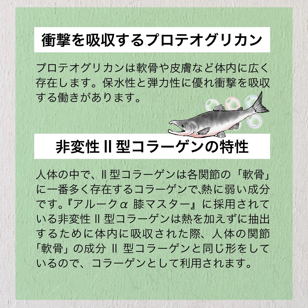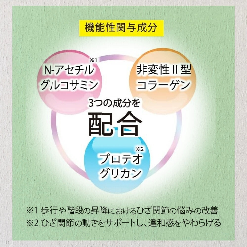 本品にはN-アセチルグルコサミン及びサケ鼻軟骨由来プロテオグリカン・サケ鼻軟骨由来非変性Ⅱ型コラーゲンが含まれます。 N-アセチルグルコサミンは、歩行や階段の昇降における、ひざ関節の悩みの改善、 サケ鼻軟骨由来プロテオグリカン・サケ鼻軟骨由来非変性Ⅱ型コラーゲンには、 中高年のひざ関節の動きをサポートし、違和感をやわらげることが報告されています。